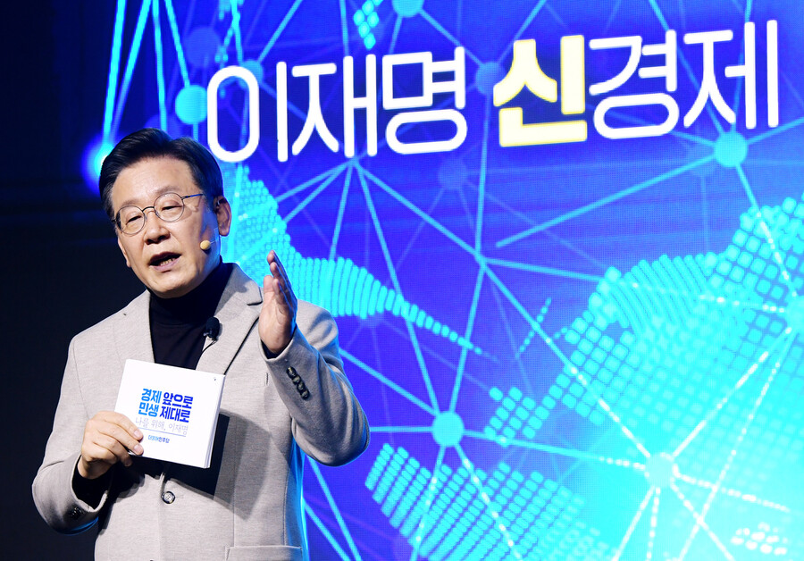 이날 발표는 기존 ‘5·5·5(세계 5강, 국민소득 5만달러, 주가 5천) 시대’ 공약을 다듬은 ‘이재노믹스’(이재명+이코노믹스)의 완성본이다. 이 후보는 신경제 비전 선포식 이후 이뤄진 질의응답 과정에서 “핵심은 국가 역할 확대를 통해 (성장을 위한) 인프라 구축에 나선다는 것”이라고 설명했다.