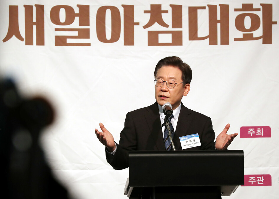 이재명 더불어민주당 대선 후보가 11일 오전 인천시 연수구 쉐라톤 그랜드 인천호텔에서 열린 ‘제20대 대선후보 초청 새얼아침대화 강연회’에서 강연하고 있다. 연합뉴스