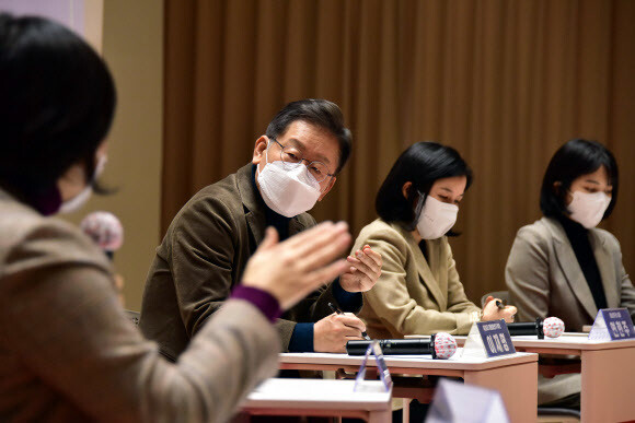 더불어민주당 이재명 대선 후보가 10일 서울 동작구 대방동 페이스살림에서 열린 ‘일하는 여성을 위한 스타트업 대표 간담회'에서 참석자의 발언을 듣고 있다.