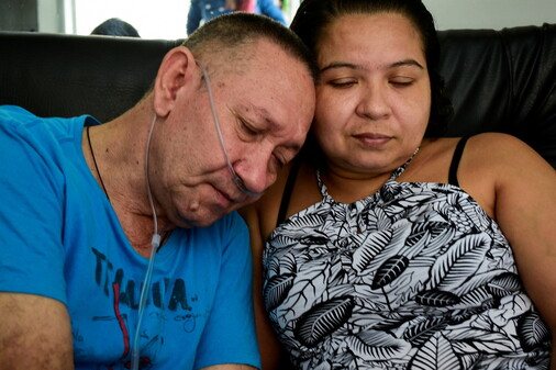 만성 폐쇄성 폐질환을 앓아온 빅토르 에스코바르(60)가 안락사 전인 2021년 10월19일 집에서 부인의 어깨에 머리를 기대고 있다. 로이터 제공/연합뉴스