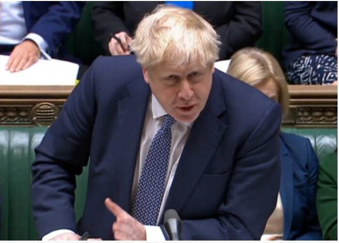 보리스 존슨 영국 총리가 12일 하원에 출석해 2020년 5월15일 총리 관저에서 코로나19 방역지침을 어기고 파티를 한 것과 관련해 의원들의 질문에 답하고 있다.