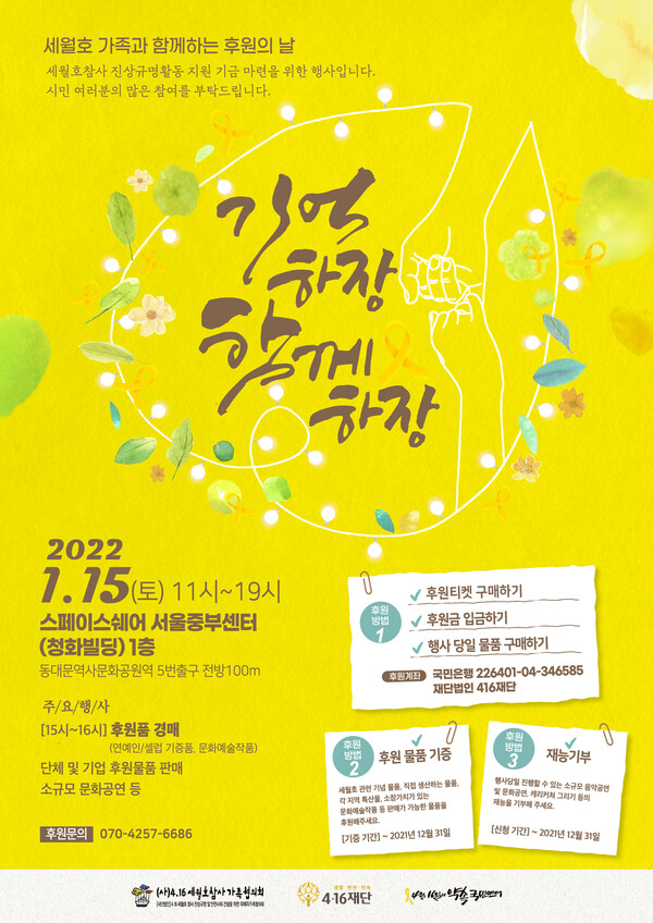 세월호 가족과 함께하는 후원의 날 ‘기억하장 함께하장’이 오는 15일 오전 11시부터 저녁 7시까지 서울 중구 스페이스쉐어 서울중부센터 1층에서 열린다. 행사는 4.16재단, 4.16세월호참사가족협의회, 4.16연대가 공동으로 주최한다.