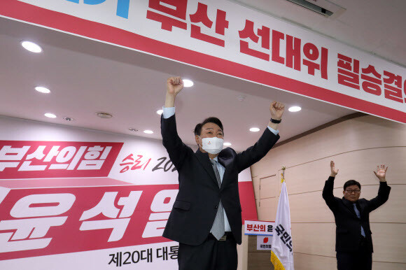 윤석열 국민의힘 대선 후보가 15일 부산 선거대책위원회 필승결의대회에 참석한 모습