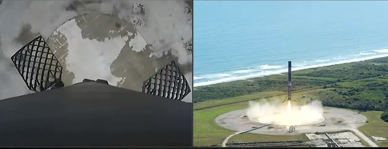 이날 10번째로 이륙한 팰컨9 로켓은 8분30초 뒤 발사기지로 돌아왔다. 왼쪽은 내장 카메라, 오른쪽은 드론으로 촬영한 것이다. 웹방송 갈무리