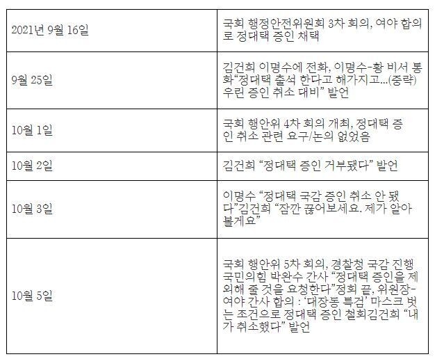그로부터 이틀이 지난 10월5일, 실제 국회 행안위에서 정대택씨 증인 출석은 전격 철회됐다. 국민의힘으로서도 경선 중이긴 하나 유력한 대선 후보였던 윤 후보에게 불리한 증인 채택을 반길 리 없어 보이나, 그간 두차례 행안위 회의에선 여야 간 이견이 없었다. 그러다 국감 당일 결국 전격적으로 증인 출석이 뒤집어진 셈이다. 당시 정씨는 피감기관인 경찰청에 이미 도착해 있었다.
