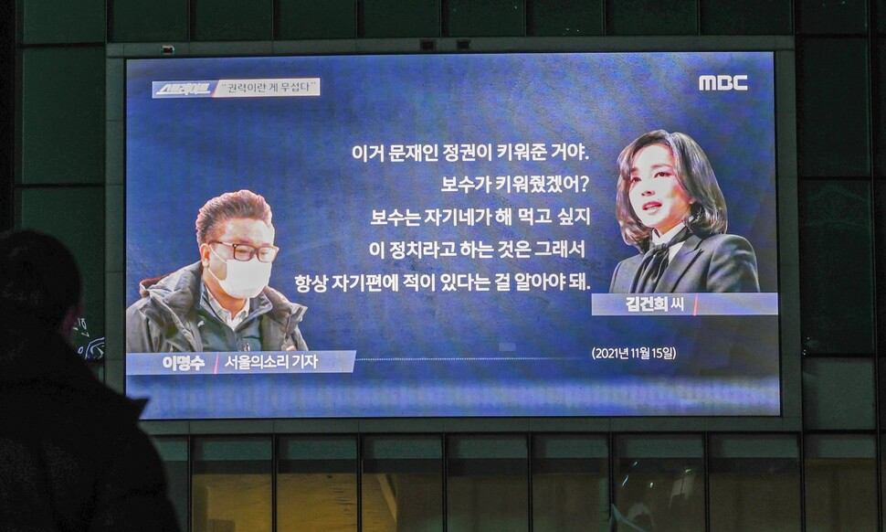 지난 16일 오후 서울 마포구 문화방송(MBC) 사옥에 걸린 전광판에서 윤석열 국민의힘 대선 후보의 배우자 김건희씨의 ‘7시간 전화 통화’ 내용을 다루는 프로그램 ‘스트레이트’가 방영되고 있다. 연합뉴스