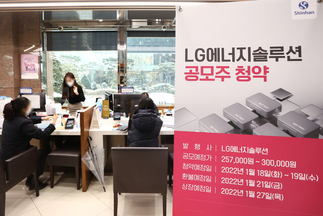 엘지(LG)에너지솔루션의 일반 투자자 대상 공모주 청약 마감일인 19일 서울 여의도 신한금융투자 영업부에서 고객들이 상담하고 있다. 연합뉴스