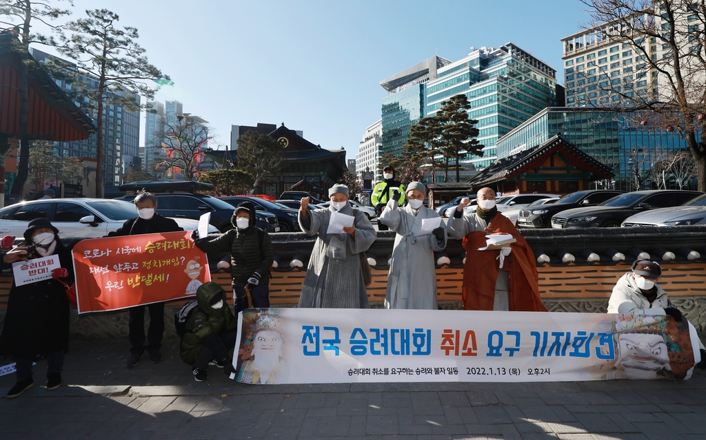 "코로나 속 국민 불안케 하는 승려대회 취소해야" = '승려대회 취소를 요구하는 불제자'라는 이름으로 모인 승려와 불교 신도 20여명은 13일 "코로나 시국에 국민을 불안하게 하는 승려대회를 취소하라"고 요구했다.