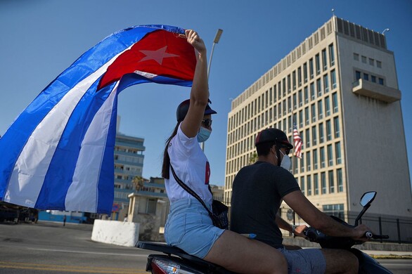 쿠바인 남녀가 아바나 주재 미국대사관 앞을 오토바이로 지나고 있다. 2021년 3월 28일 촬영됐다. AFP 연합뉴스