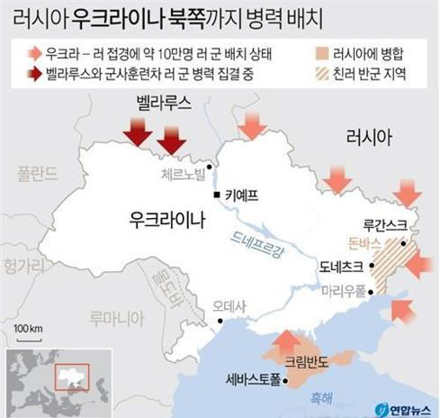 러시아군 병력과 장비들은 우크라이나 국경에 16㎞ 정도 근접해 배치되어 있는 것으로 보인다고 <가디언>은 보도했다. 우크라이나 언론들은 러시아 병력이 우크라이나와 접경한 벨라루스의 옐스크에 도착했다고도 보도했다. 러시아는 다음달 10일부터 열리는 벨라루스군의 연합 훈련을 이유로 벨라루스에 병력을 파견했다. 정의길 기자