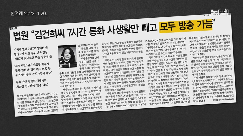 윤석열 국민의힘 대선 후보의 부인 김건희씨가 인터넷 매체 <서울의 소리> 기자와 나눈 대화 녹취가 추가로 공개돼 파문이 일파만파 커지고 있습니다. 김씨는 반복적인 허위 이력 기재와 도이치모터스 주가조작 연루 등 갖가지 의혹의 중심에 서 왔습니다. 그래서 통화 내용에 더 관심이 쏠린 듯합니다. 서울중앙지법은 지난 19일 총 7시간45분 분량의 통화 녹취 전체에 대해 사실상 모두 방송해도 문제가 없다는 결정을 내렸습니다.