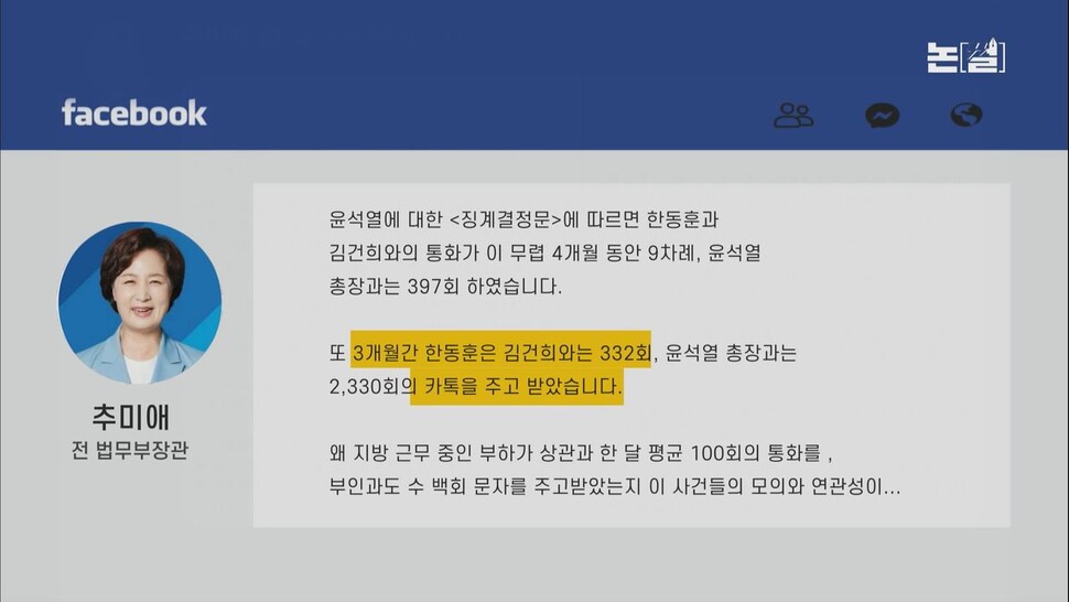 ‘국정농단’ 연상시키는 김건희 ‘7시간 통화’관련 추미애 전 장관의 페이스북