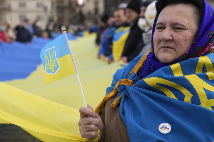미국 등이 러시아의 우크라이나 침공 가능성을 경고한 가운데 22일 체코 프라하에서 열린 우크라이나 주권 옹호 시위에서 한 여성이 우크라이나 국기를 들고 참가했다. 프라하/AP 연합뉴스
