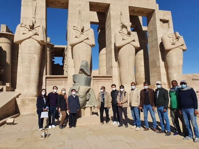 이집트 라메세움 신전 앞에서 김현모 청장을 비롯한 한국 문화재청 인사들과 이집트 현지 관계자들이 찍은 기념사진.