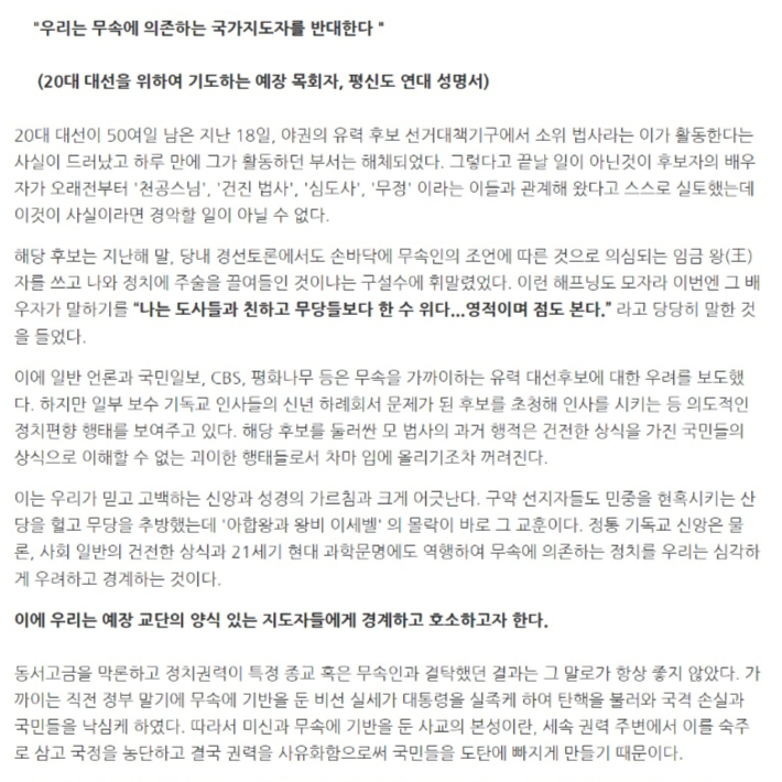 "무속에 의존하는 정치, 기독교 신앙· 건전한 상식에 역행"