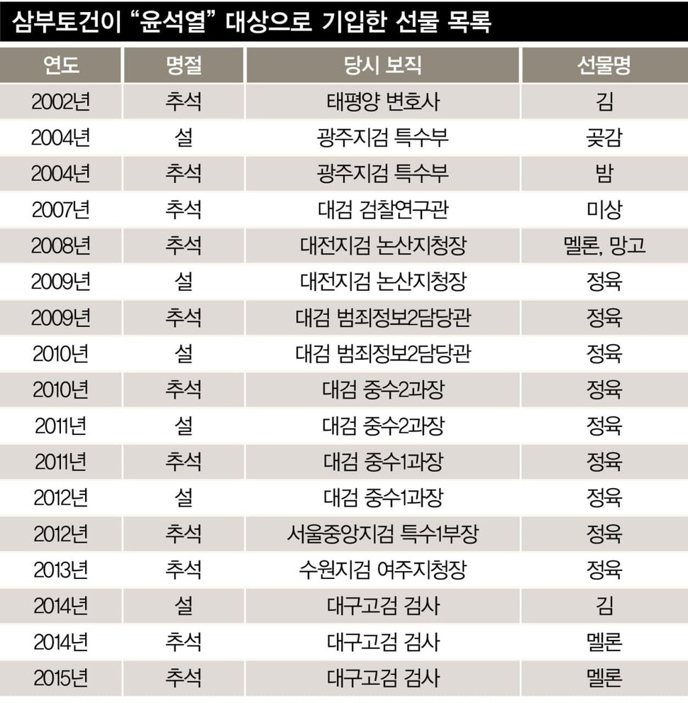 삼부토건 매출전표와 관계자의 말을 종합하면, 정육은 30만~40만원대 선물인데, 선물을 차등해 보냈던 조 회장이 노태우 전 대통령, 국무총리 등에게 선별해 보냈던 품목이다. 윤 후보는 2008~13년 지청장, 대검찰청 중앙수사과장 등의 직함과 함께 “윤석열 (직함) 정육”이라고 적혀 있었다. 윤 후보 외 다른 검사들은 검사장급 인사라도 이보다 낮은 등급의 선물을 보낸 걸로 돼 있다. 삼부토건 관계자는 “윤석열이 부장급 검사 시절부터, 삼부 관련 수사 등에 관여할 수 있다고 판단한 경영진이 전직 대통령, 총리 등과 같은 급의 선물을 보내다가 (국가정보원 댓글 사건으로 인해) 좌천된 이후에는 선물의 급을 낮춘 것”이라고 말했다. 실제 2008년 이명박 비비케이(BBK) 사건 파견검사 이후인 2009년부터 특수부 부장검사, 대검 중수과장, 중앙지검 특수부장 등을 역임하던 2013년까지 정육을 보내다, 2015년 대구고검 시절엔 설과 추석에 멜론 내지 김으로 선물 품목을 바꾼 걸로 돼 있다.