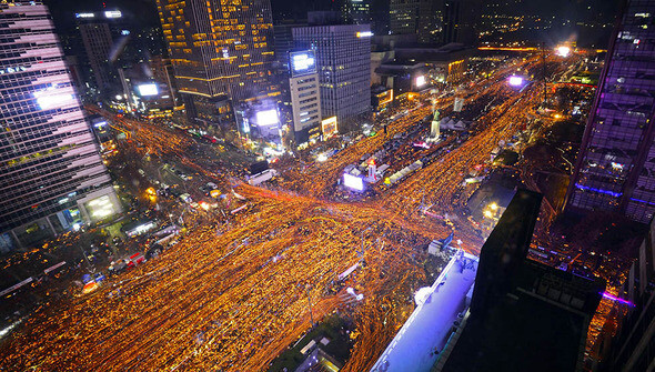 2016년 12월3일 오후 서울 광화문광장에서 열린 박근혜 대통령 퇴진을 요구하는 6차 주말 촛불집회에 참가한 시민들이 촛불을 들고 청와대 방향으로 행진하고 있다.