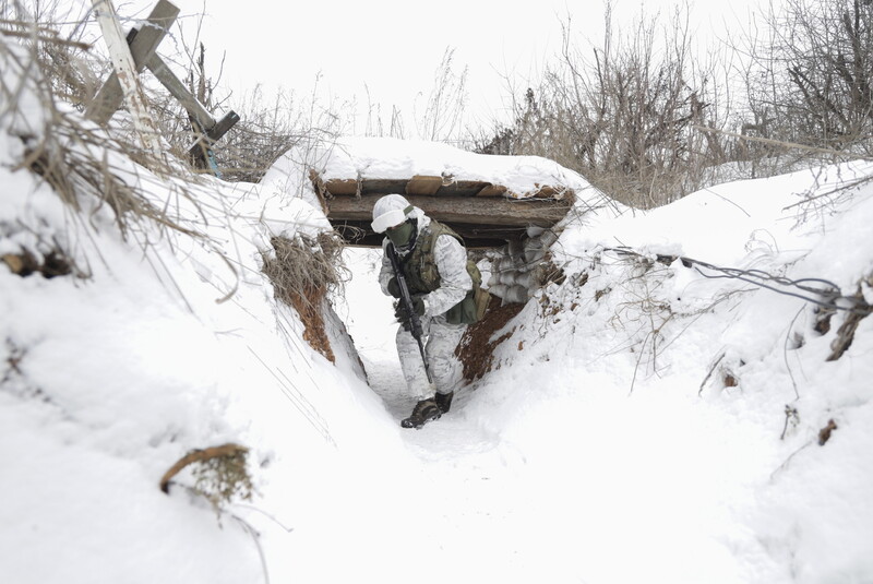 우크라이나 병사가 27일 러시아와의 국경 지대인 동부 루한스크에 설치된 참호 안을 걷고 있다. 루한스크/AP 연합뉴스