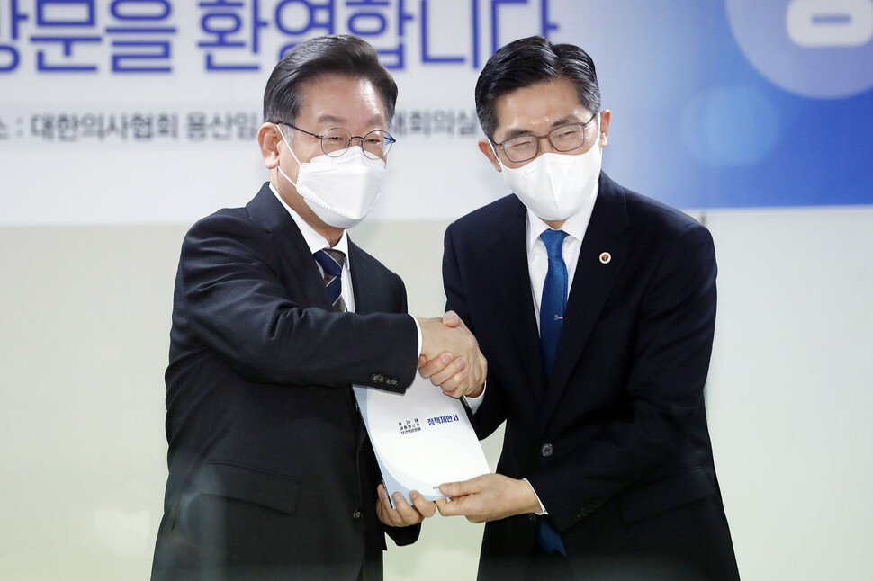 더불어민주당 이재명 대선 후보가 28일 서울 용산구 대한의사협회를 방문해 이필수 대한의사협회 회장으로부터 정책제안서를 전달받고 있다.