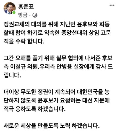홍 의원은 이날 페이스북에 “정권교체의 대의를 위해 지난번 윤석열 대선후보와 회동할 때 참여하기로 약속한 중앙선대위 상임고문직을 수락한다”고 밝혔다. 홍 의원은 “더는 무도한 정권이 계속되어 대한민국을 농단하지 않도록 윤 후보가 요청하는 대선 자문에 적극 응하도록 하겠다”며 “새로운 세상을 만들도록 노력하겠다”고 했다.