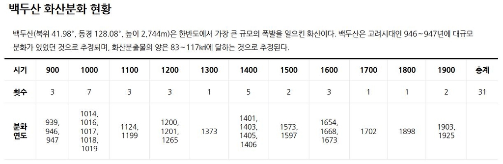 31일 기상청에 따르면 900년대부터 현재까지 백두산은 31번 분화했다.