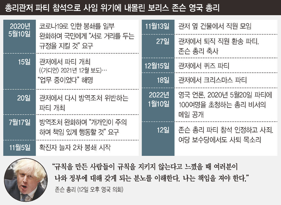 하지만, 존슨 총리는 야당은 물론 여당 내에서도 큰 비난을 받으며 사면초가에 몰려 있다. 제1야당인 노동당의 키어 스타머 대표는 “영국 국민들은 팬데믹 기간 고통스러운 희생을 치렀다. 존슨 총리는 국민의 희생을 무시하고, 공직에 적합하지 않다는 사실을 스스로 드러냈다”고 비판 수위를 높였다. 여당인 보수당의 앤드루 미첼 의원도 “존슨 총리를 더이상 지지하지 않는다”고 했고, 테리사 메이 전 총리도 “존슨 총리와 주변인들은 해당 규정을 읽지 않았거나, 그게 무슨 의미인지 이해하지 못했다. 아니면 자신들에게 적용된다고는 생각하지 않았을 수 있다. 어느 쪽인가?”라고 되물었다. 길윤형 기자