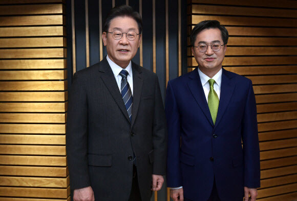 이재명 더불어민주당 대선 후보와 김동연 새로운물결 대선 후보가 2일 서울시 양천 목동 <시비에스>(CBS)에서 열린 양자 정책토론회에 앞서 포즈 취하고 있다.