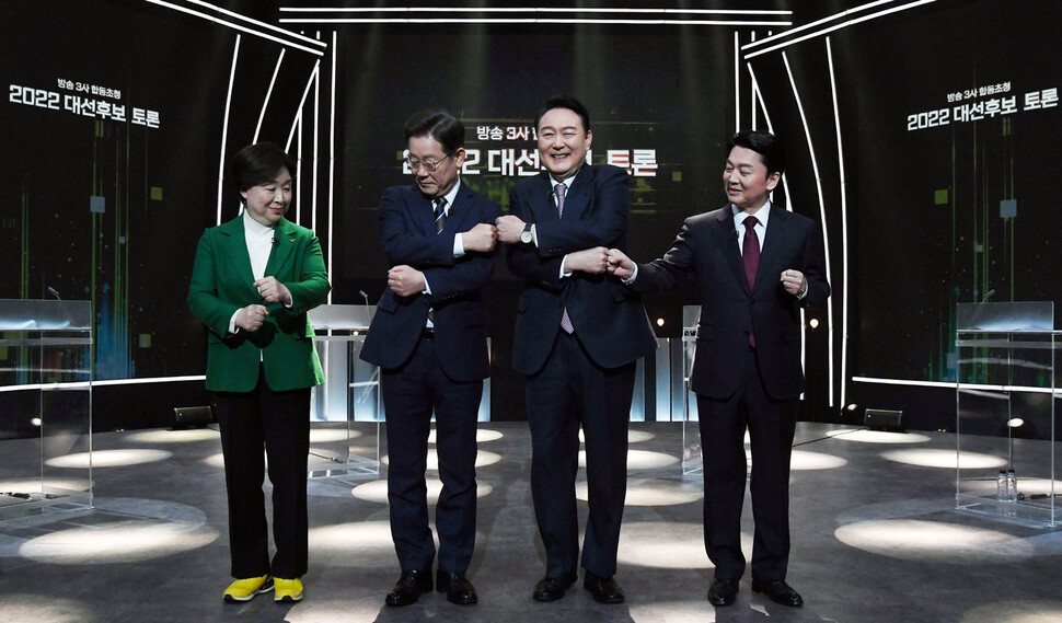 3일 오후 서울 여의도 KBS 공개홀에서 열린 <방송 3사 합동 초청 2022 대선후보 토론에서 후보들이 기념촬영을 하고 있다. 왼쪽부터 정의당 심상정 후보, 더불어민주당 이재명 후보, 국민의힘 윤석열 후보, 국민의당 안철수 후보.