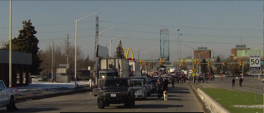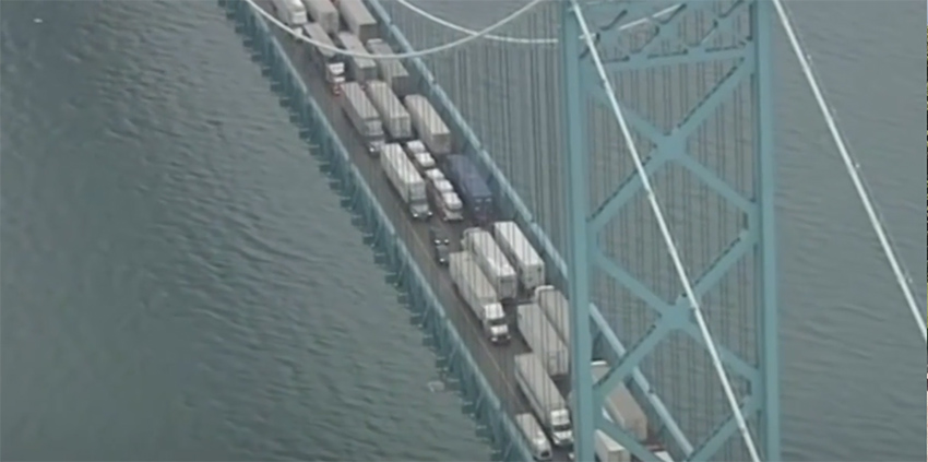 윈저와 미국 디트로이트를 잇는 앰배서더 브릿지를 점거하고 있는 트럭 시위대