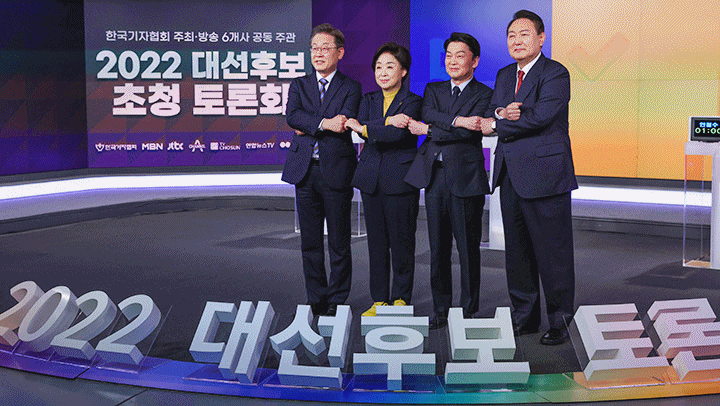 지난 3일 오후 서울 여의도 한국방송(KBS) 공개홀에서 열린 2022 대선 후보 토론에서 후보들이 리허설 준비를 하고 있다. 이날 토론에서 윤석열 국민의힘 후보가 기후위기 의제 관련 용어를 이해하지 못해 논란이 됐다.