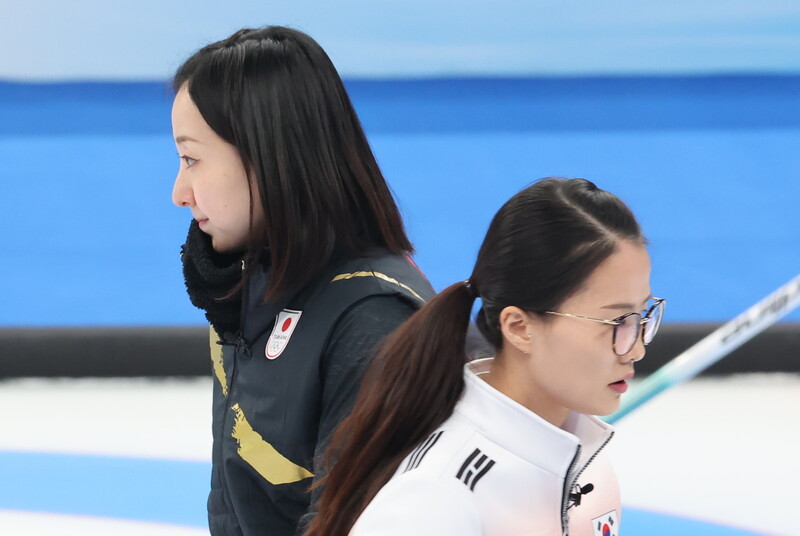 양 팀 주장인 한국 김은정과 일본 후지사와 사쓰키가 14일 중국 베이징 국립 아쿠아틱센터에서 열린 2022 베이징겨울올림픽 컬링 여자 단체전에서 경기에 임하고 있다. 베이징/연합뉴스