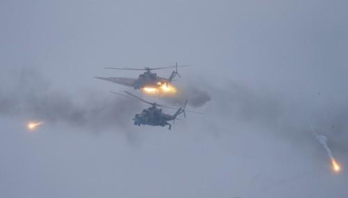 헬기 사격하며 연합훈련 하는 러시아-벨라루스군= 17일 우크라이나와 국경을 접한 벨라루스 오시포비치 훈련장에서 러시아와 벨라루스군이 연합훈련을 벌이면서 헬기 사격을 하고 있다. 우크라이나를 둘러싼 군사적 긴장이 고조되고 있는 가운데 러시아는 우방인 벨라루스의 훈련장에서 '연합의 결의 2022'로 명명된 연합훈련을 오는 20일까지 벌일 예정이다. (오시포비치 AP=연합뉴스)