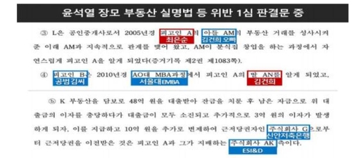 윤석열 장모 부동산 실명법 등 위반 1심 판결문 중