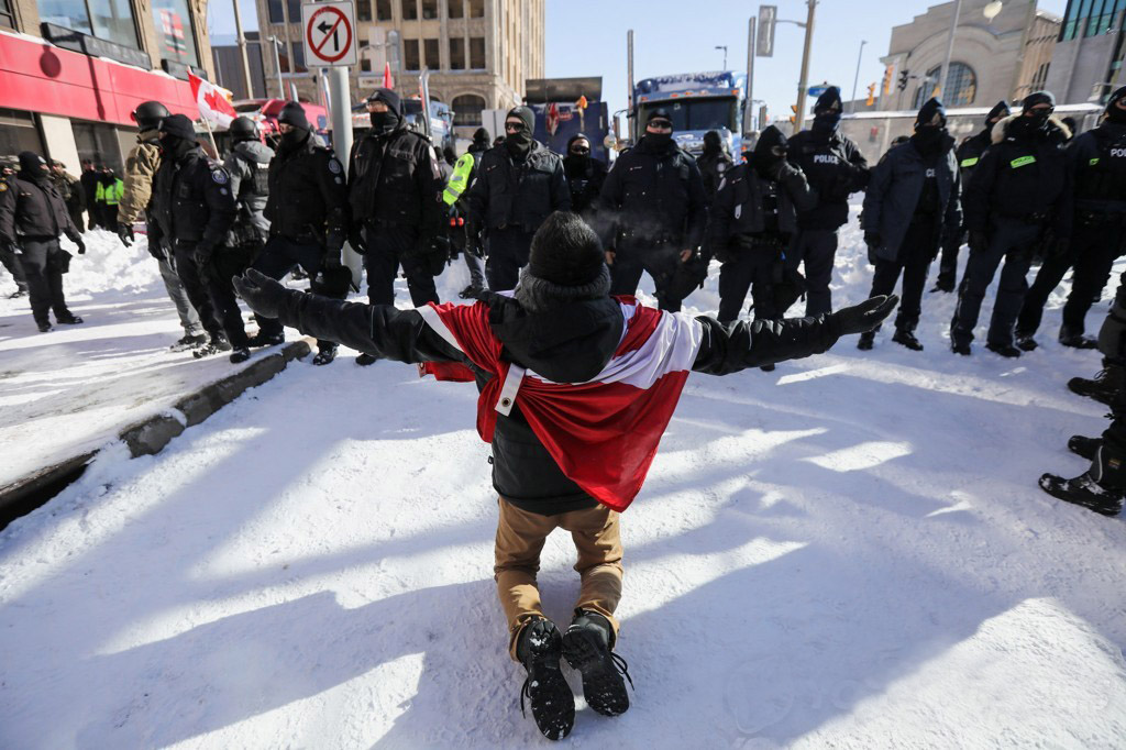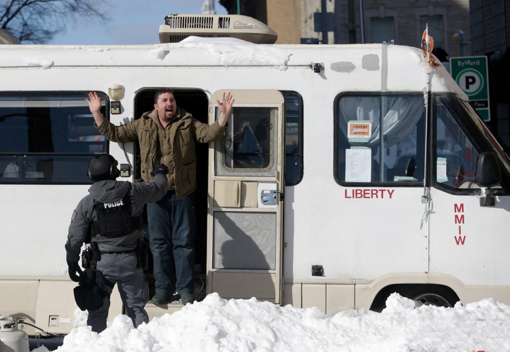 현장에서는 무기를 소지하고 특수기동대 유니폼을 입은 경찰대원 100여 명이 오타와 도심을 봉쇄 중인 트럭과 트랙터, 캠핑카 등 시위 차량 사이를 누비며 해산을 경고하고 트럭을 견인했다.