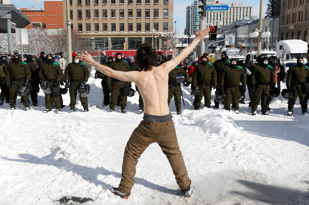 웃통 벗고 경찰에 맞선 캐나다 오타와의 트럭시위 참가자 [오타와 로이터=연합뉴스]