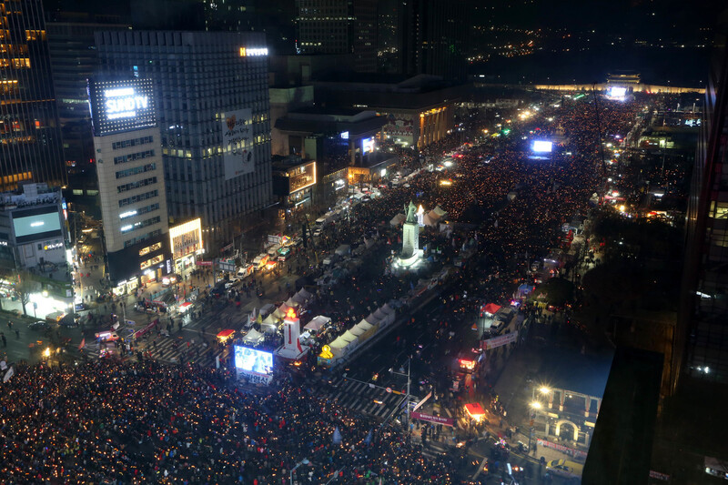 2016년의 마지막날 서울 광화문광장을 가득 메운 촛불 시민들. 촛불집회는 2017년 4월29일까지 이어졌다.