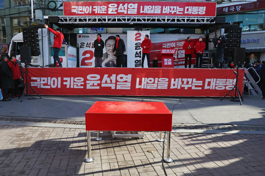 윤 후보는 이날 오전 9시 경북 영주시 하망동에서 선거 유세에 나설 예정이었다. 하지만 유세 시작 20분 전인 오전 8시40분, 국민의힘 선거대책본부 공보단이 윤 후보의 유세 일정 전면 취소 소식을 문자메시지로 공지할 때까지, 현장에서는 아무도 이런 사실을 알지 못 했다.