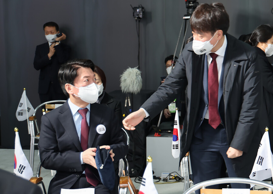 안철수 국민의당 대선 후보(왼쪽)가 1일 서울 서대문구 국립 대한민국임시정부 기념관에서 열린 제103주년 3·1절 기념식에서 이준석 국민의힘 대표가 악수하자며 손을 내밀자 바라보고 있다. 연합뉴스
