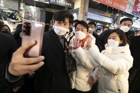 안철수 국민의당 대선 후보와 부인 김미경씨가 지난달 26일 오후 서울 종로구 광장시장을 찾아 한 지지자와 기념사진을 찍고 있다.