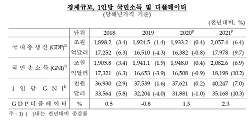 한국은행이 3일 발표한 '2021년 4분기 및 연간 국민소득(잠정)' 통계에 따르면 지난해 1인당 GNI는 3만5천168달러로 2020년(3만1천881달러)보다 10.3% 증가했다.