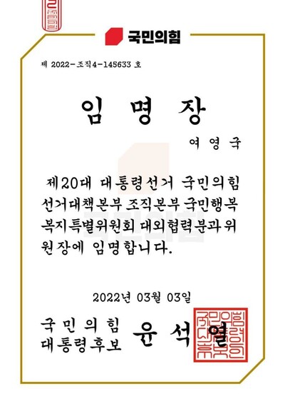 4일 <한겨레> 취재를 종합하면, 2일 오후 6시께 5·18구속부상자회 회원 수십명에게 ‘제20대 대통령선거 국민의힘 선거대책본부 조직본부 공정한나라 특보에 임명합니다’라고 적힌 임명장 사진 파일이 휴대전화 문자메시지로 전달됐다. 임명장에는 ‘국민의힘 대통령후보 윤석열’ 명의와 함께 직인이 찍혀 있다. 발신번호는 ‘02-6288-0200’으로, 국민의힘 대표 전화번호다.