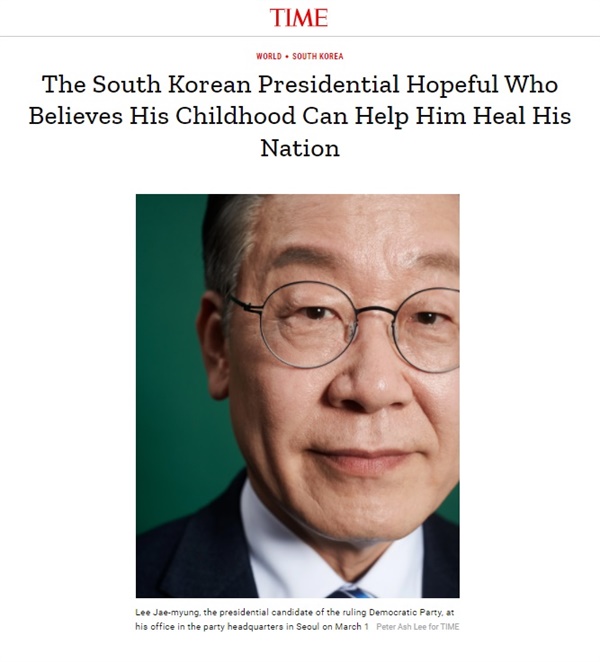 미국 시사주간지 <타임>이 이재명 더불어민주당 대선후보를 소개했다. <타임>은 3일(현지시각) '자신의 어린 시절이 조국을 치유하는 데 도움이 될 수 있다고 믿는 한국의 대선후보'라는 제목으로 이재명 후보와의 단독 인터뷰 기사를 실었다. 경쟁상대인 윤석열 국민의힘 후보 관련 기사는 없다. <타임>은 윤 후보에 대해선 "후보가 인터뷰 요청을 거절했다"라고 설명했다.