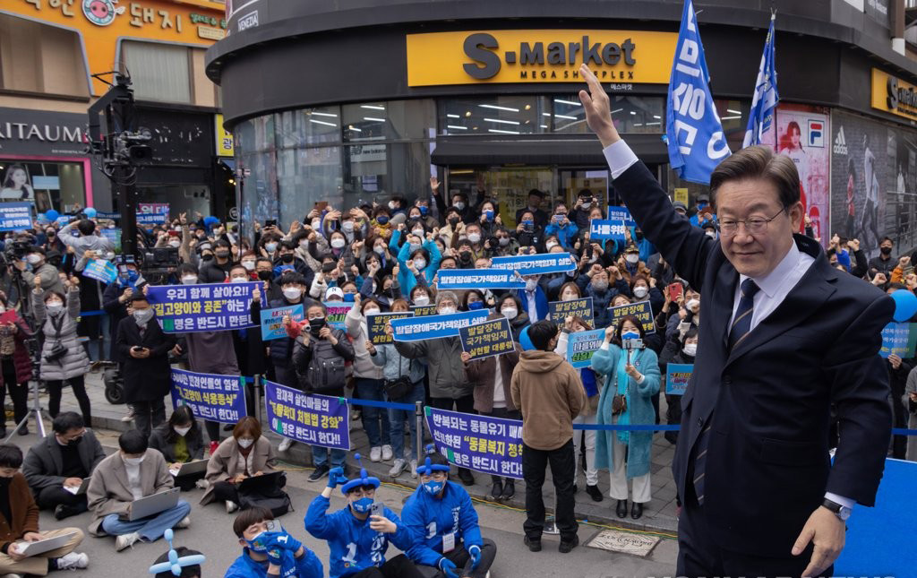 지지자에게 인사하는 이재명 대선후보= 더불어민주당 이재명 대선후보가 4일 서울시 광진구 어린이대공원 후문에서 열린 '더 큰 중랑! 새로운 광진! 뭉치면 이깁니다!' 중랑-광진 유세에서 지지자에게 인사하고 있다.