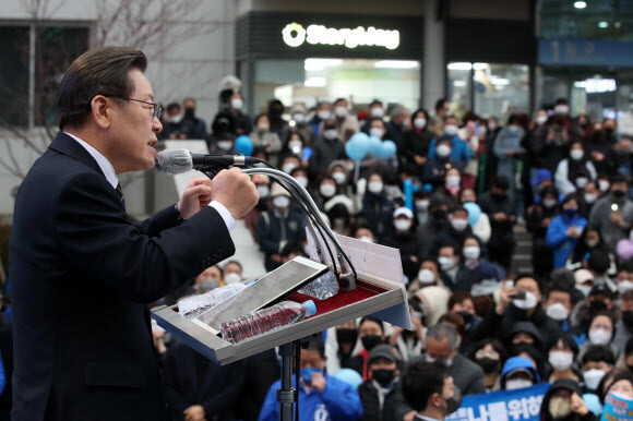 이 후보는 이날 경기 성남 서현역 로데오거리에서 열린 현장 유세에서 “사랑하는 성남시민 여러분. 여러분의 이웃, 양지마을 주민 이재명 인사드린다”라며 말문을 열었다. 이 후보는 “열세살 꼬맹이가 어머니 손잡고 공장에 출근하고 낮에는 일하고 밤에는 검정고시를 해서 결국 이 자리까지 왔다”며 “저를 키워준 것도, 이 자리에 오게 한 것도 제 사랑하는 이웃들 우리 성남시민 여러분 아니겠느냐. 진심으로 감사드리고 사랑한다”고 말했다.