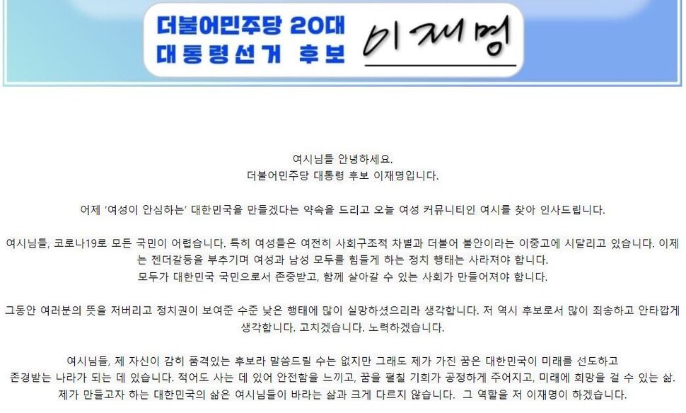 이 후보는 ‘여시님들 안녕하세요. 더불어민주당 대통령 후보 이재명입니다’라는 제목의 글에서 “여시님들, 코로나19로 모든 국민이 어렵다. 특히 여성들은 여전히 사회구조적 차별과 더불어 불안이라는 이중고에 시달리고 있다”며 “이제는 젠더갈등을 부추기며 여성과 남성 모두를 힘들게 하는 정치 행태는 사라져야 한다”고 썼다. 이어 △데이트 폭력 처벌법 제정 △디지털성범죄 피해자 원스톱지원센터 전국 확대 △성범죄 처벌 대폭 강화 △연대관계등록제 등의 공약을 소개했다.