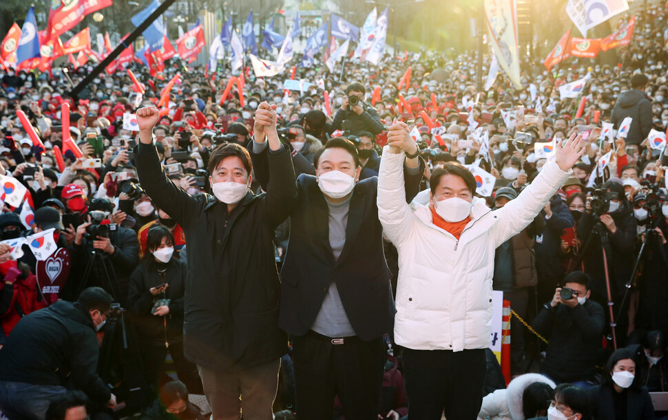 국민의힘 윤석열 대선 후보가 5일 저녁 서울 광진구 어린이대공원 후문 광장에서 이준석 대표, 국민의당 안철수 대표와 함께 공동 유세를 하고 있다.