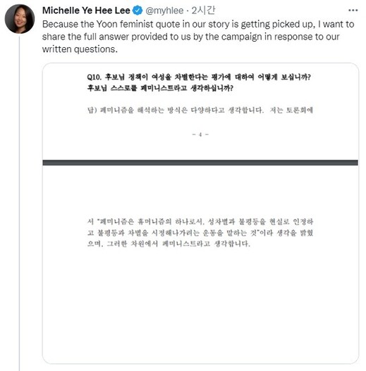 그러자 기사를 작성한 미셸 예희 리 워싱턴 포스트 도쿄·서울지국장은 자신의 트위터에 “우리에게 제공된 답변 원문을 공유하겠다”며 답변 원문을 공개했다. 이를 보면 윤 후보는 “페미니즘을 해석하는 방식은 다양하다고 생각한다. 저는 토론회에서 ‘페미니즘은 휴머니즘의 하나로서, 성차별과 불평등을 현실로 인정하고 불평등과 차별을 시정해나가려는 운동을 말하는 것’이라는 생각을 밝혔으며, 그러한 차원에서 페미니스트라고 생각한다”고 답했다. 리 지국장은 “우리는 기사 속에서 전체 답변을 그대로 인용했다”고 강조했다.