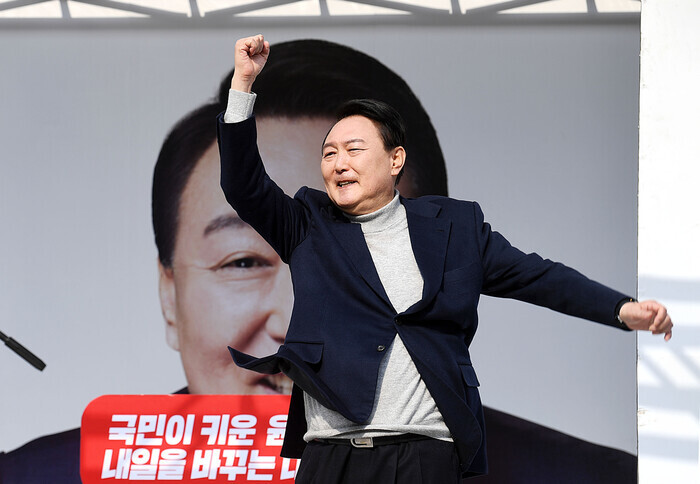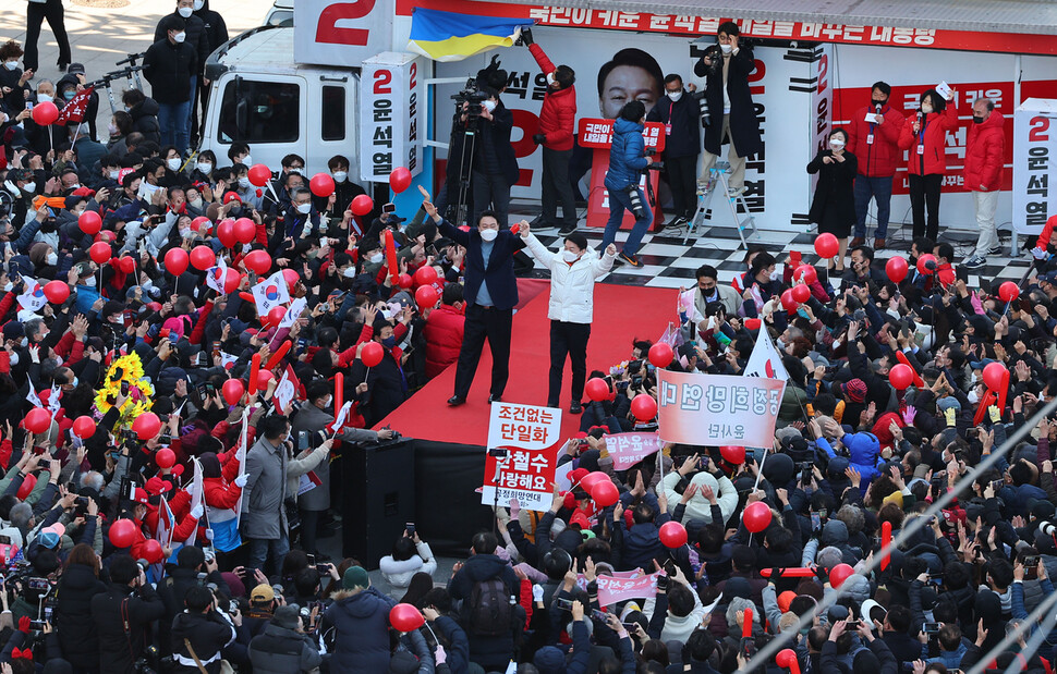 윤석열 국민의힘 대선후보가 유세 현장에서 지지를 호소하고 있다.