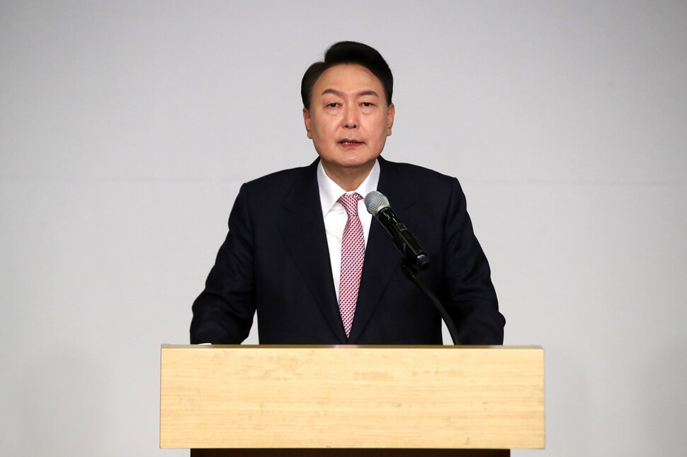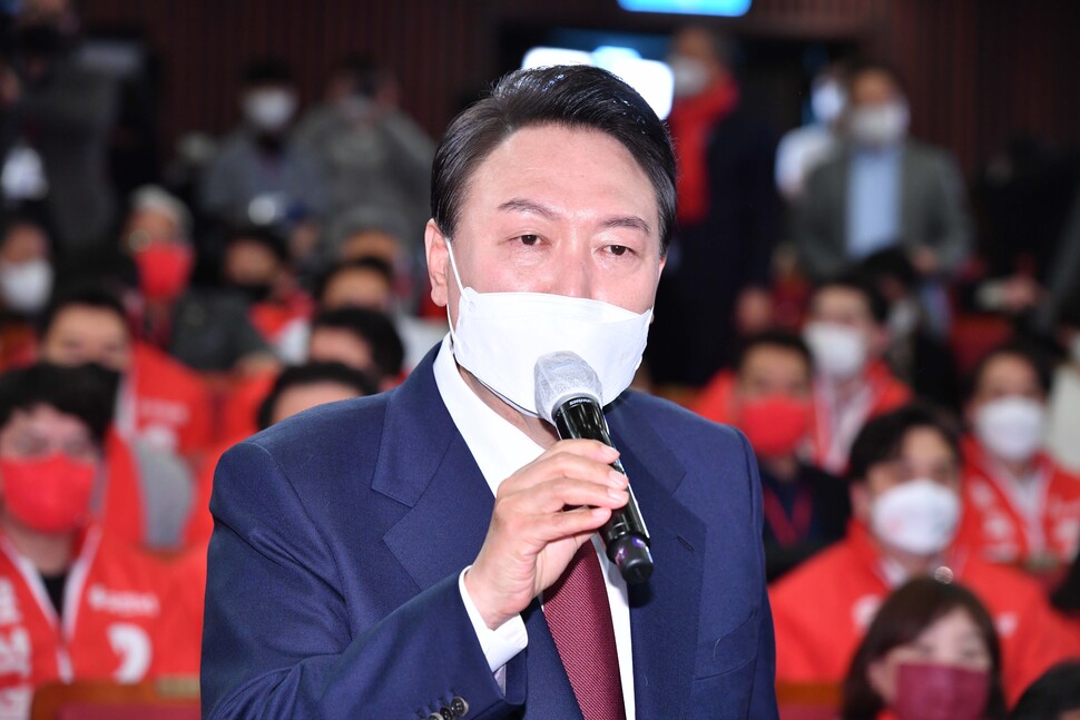 윤석열 대통령 당선인이 10일 오전 서울 여의도 국회에서 당선 인사 기자회견을 하고 있다.