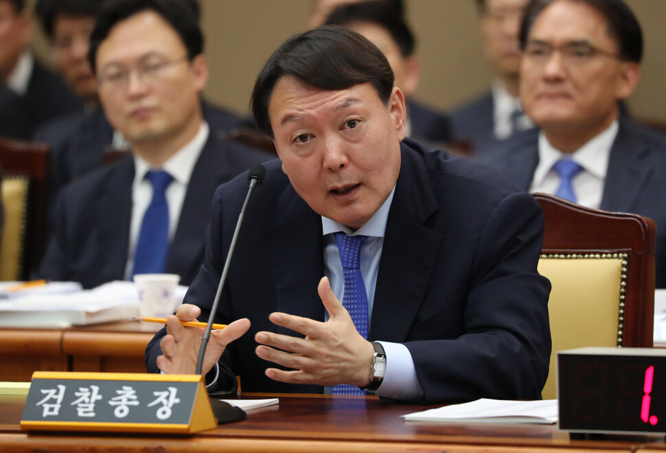 윤석열 대통령 당선자가 검찰총장 시절인 2019년 10월17일 오후 서울 서초구 대검찰청에서 열린 국회 법제사법위원회의 대검찰청에 대한 국정감사에서 질의에 답하고 있다.